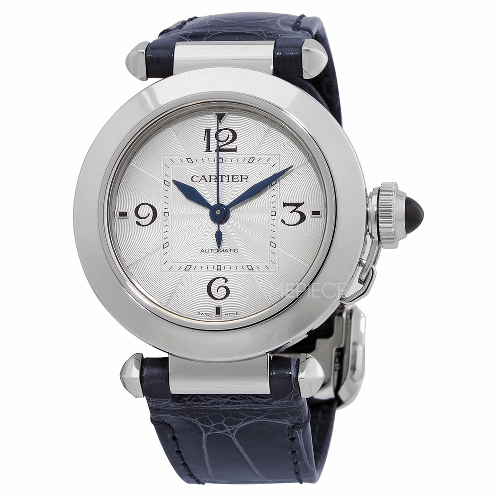 Stainless steel case with a blue (alligator) leather strap. Fixed stainless steel bezel. Silver dial with blue hands and index hour markers. Arabic numerals appear at the 3, 6, 9 and 12 o'clock positions. Minute markers around an inner ring. Dial Type: Analog. Cartier calibre 1847 MC automatic movement, containing 23 Jewels, bitting at 28800 vph, and has a power reserve of approximately 42 hours. Scratch resistant sapphire crystal. Screw down crown set with synthetic spinels. Transparent case back. Round case shape. Case size: 35 mm. Case thickness: 9.37 mm. Deployment clasp. Water resistant at 100 meters / 330 feet. Functions: date, hour, minute, second. Pasha Series. Luxury watch style. Watch label: Swiss Made. Cartier Pasha Automatic Silver Dial Black Leather Watch WSPA0012.