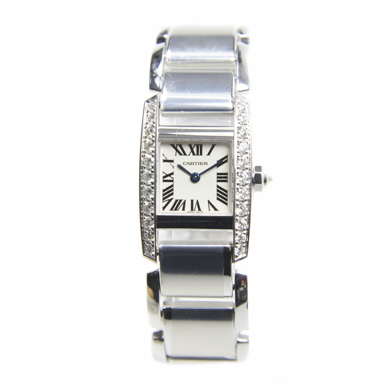 18kt white gold case with a white gold-tone 18kt white gold bracelet. 22 diamonds silver-tone diamond set bezel. Silver dial with sword-shaped hands and Roman numerals hour markers. Dial Type: Analog. Quartz movement. Scratch resistant sapphire crystal. Octagonal crown set with a diamond crown. Square case shape, case size: 20 mm, case thickness: 6 mm. Hidden deployment clasp. Water resistant at 30 meters / 100 feet. Functions: hours, minutes. Luxury watch style. Watch label: Swiss Made. Item Variations: WE70039H, Cartier-WE70039H. Cartier Tankissime Diamond 18kt White Gold Ladies Watch WE70039H.