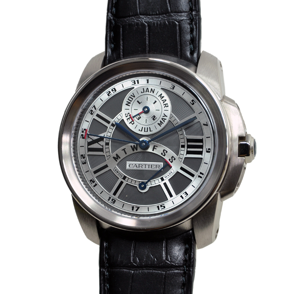 18 kt white gold case with a black alligator leather strap. Fixed bezel. Grey guilloche dial with blue sword-shaped hands and index and Roman numeral hour markers. Minute markers around an inner ring. Dial Type: Analog. Date display around an outer ring. Month and day of the week sub-dials. Automatic movement. Scratch resistant sapphire crystal. 18 kt white gold crown set with sapphire cabochon. Skeleton case back. Case diameter: 42 mm. Case thickness: 16.5 mm. Round case shape. Deployment clasp with push button. Water resistant at 30 meters / 100 feet. Functions: month, date, day, hour, minute. Luxury watch style. Watch label: Swiss Made. Cartier Calibre de Cartier Perpetual Calendar 18 kt White Gold Mens Watch W7100030.