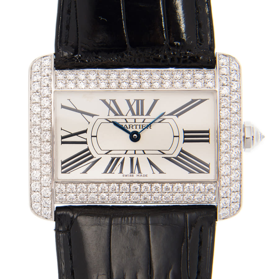 18kt white gold case with a black leather strap. Fixed 18kt white gold diamond set bezel. Cream dial with blued-steel sword-shaped hands and black Roman numeral hour markers. Minute scale around the inner rim. Dial Type: Analog. Automatic movement. Scratch resistant sapphire crystal. Solid case back. Rectangle case shape, case size: 38 mm x 28 mm, case thickness: 7 mm. Tang clasp. Water resistant at 30 meters / 100 feet. Functions: hour, minute. Tank divan series. Luxury watch style. Watch label: Swiss Made. Cartier Tank Divan Cream Dial Ladies 18 Carat White Gold Diamond Watch WA301370.
