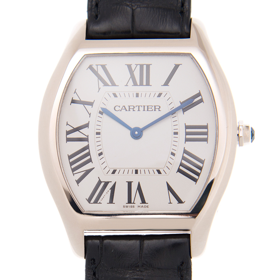 18k white gold case with a black crocodile leather strap. Fixed bezel. Silver dial with blued steel hands and Roman numeral hour markers. Minute markers around the inner rim. Dial Type: Analog. Hand wind movement. Caliber 430 mc engine. Scratch resistant sapphire crystal. Case diameter: 44.95 mm. Buckle clasp. Water resistant at 30 meters / 100 feet. Functions: hour, minute. Luxury watch style. Cartier Tortue Silver Dial 18k White Gold Mens Watch WGTO0003.