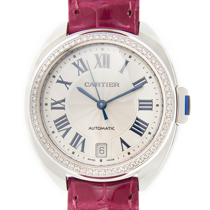 18kt white gold case with a fuchsia pink alligator leather strap. Diamond set fixed 18kt white gold diamond set bezel. Flinque dial with blued-steel sword-shaped hands and black Roman numeral hour markers. Minute markers around the outer rim. Dial Type: Analog. Date display at the 6 o'clock position. Cartier Calibre 1847 MC Automatic movement, containing 23 Jewels, bitting at 28800 vph, and has a power reserve of approximately 42 hours. Scratch resistant sapphire crystal. Cabochon crown. Cushion case shape, case size: 40 mm, case thickness: 11.76 mm. Tang clasp. Water resistant at 30 meters / 100 feet. Functions: date, hour, minute, second. Cle Series. Luxury watch style. Watch label: Swiss Made. Cartier Cle Automatic Diamond Ladies Watch WJCL0011.