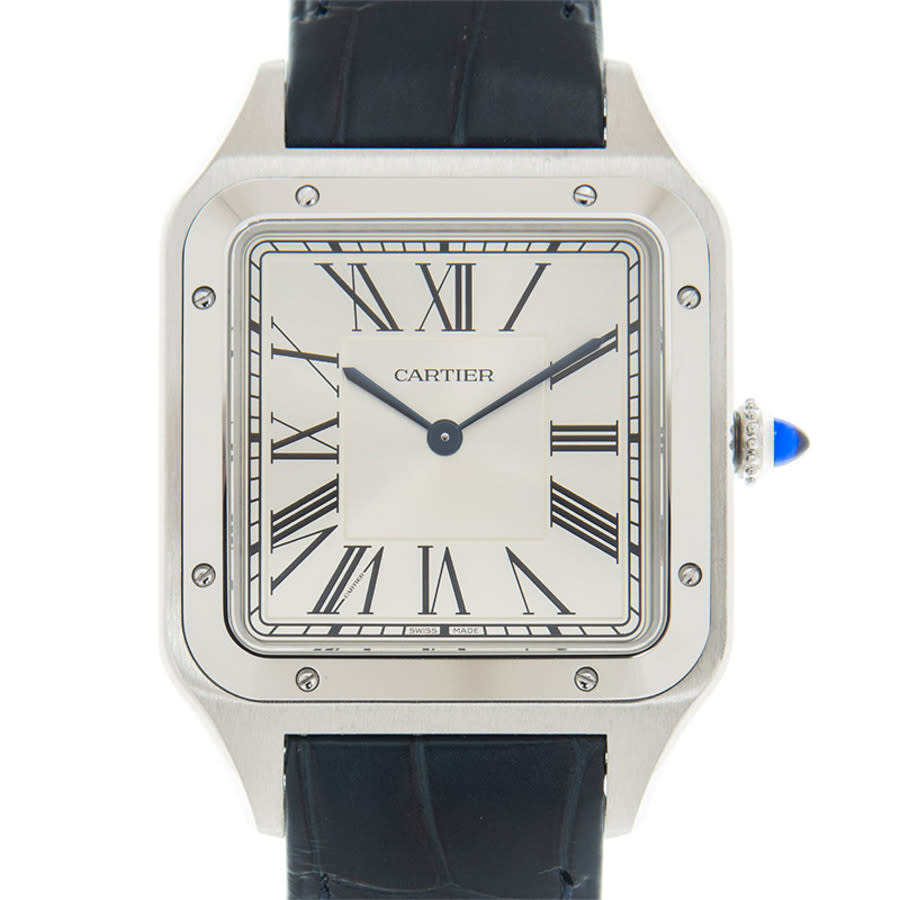 Stainless steel case with a blue (alligator) leather strap. Fixed stainless steel bezel. Silver dial with blue hands and Roman numeral hour markers. Minute markers around the outer rim. Dial Type: Analog. Cartier calibre 430 MC hand wind movement, based upon Piaget 430P, containing 18 Jewels, bitting at 21600 vph, and has a power reserve of approximately 40 hours. Scratch resistant sapphire crystal. Push / pull crown set with a blue synthetic cabochon-shaped spinel. Solid case back. Rectangle case shape. Case dimensions: 46.6 mm x 33.9 mm. Case thickness: 7.5 mm. Tang clasp. Water resistant at 30 meters / 100 feet. Functions: hour, minute. Santos Dumont Series. Luxury watch style. Watch label: Swiss Made. Cartier XL Santos Dumont Hand Wind Silver Dial Mens Watch WSSA0032.