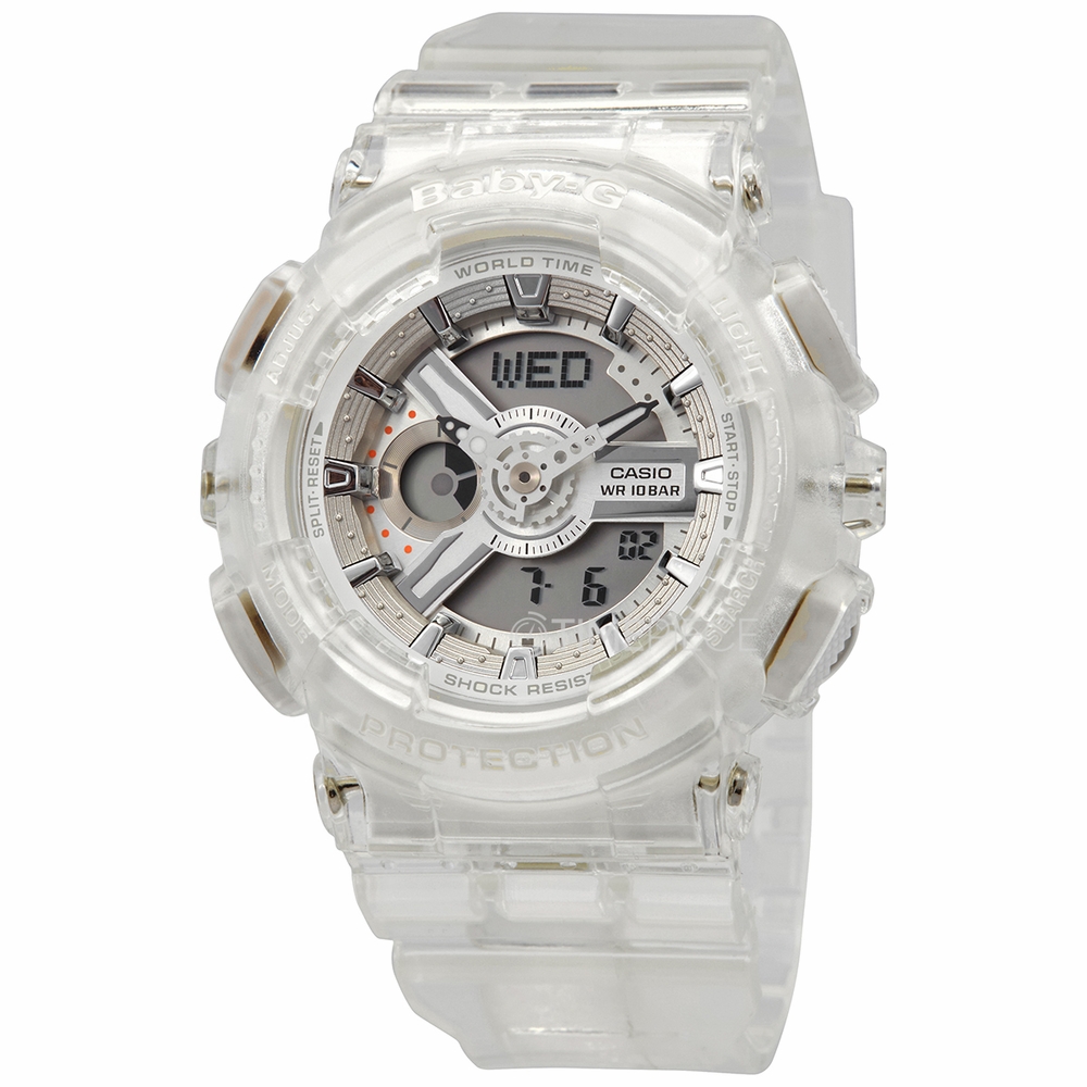 White resin case with a white resin strap. Fixed white resin bezel. Clear dial with luminous silver-tone hands and index hour markers. Minute markers. Dial Type: Analog-Digital. Luminescent hands. Digital sub-dials. Quartz movement. Scratch resistant mineral crystal. Solid case back. Round case shape. Case dimensions: 46.3 mm × 43.4 mm. Case thickness: 15.8 mm. Band width: 16 mm. Tang clasp. Water resistant at 100 meters / 330 feet. Functions: date indicator, world time, led display, day indicator, chronograph, water-resistant, mineral crystal, timer, shock-resistant, backlight, alarm, 12-hour dial, day/date. Baby-g Series. Sport watch style. Casio Baby-G Alarm World Time Chronograph Quartz Analog-Digital Ladies Watch BA-110CR-7ADR.