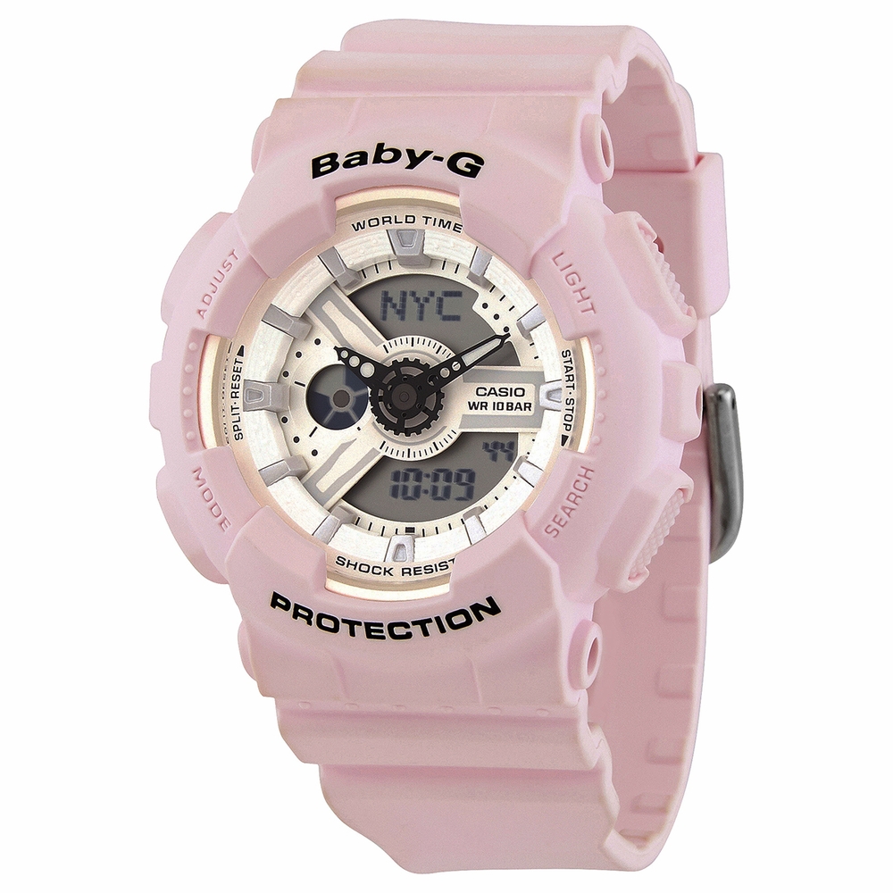 Pink resin case with a pink resin strap. Fixed pink resin bezel. Digital dial with black hands and index hour markers. Minute markers. Dial Type: Analog-digital. Luminescent neobrite. Digital sub-dials. Quartz movement. Scratch resistant mineral crystal. Solid case back. Round case shape. Case dimensions: 46.3 mm x 43.4 mm. Case thickness: 15.8 mm. Tang clasp. Water resistant at 100 meters / 330 feet. Functions: hour, minute, second, world time (29 time zones), 1/100-second stopwatch, countdown timer, 5 daily alarms (with 1 snooze alarm), 12/24-hour format. Baby-g Series. Sport watch style. Item Variations: BA110BE-4A, BA-110BE-4A. Casio Baby-G Alarm World Time Quartz Analog-Digital Ladies Watch BA110BE4ADR.