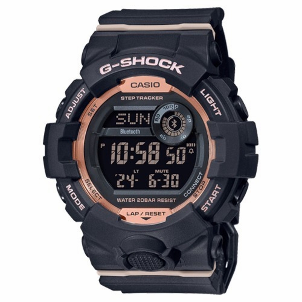 Black resin case and strap. Fixed black resin bezel. Digital dial. Dial Type: digital. Quartz movement. Scratch resistant mineral crystal. Solid case back. Round case shape, case size: 50.7 x 45.2 mm, case thickness: 15.5 mm. Tang clasp. Water resistant at 200 meters / 660 feet. Functions: date, day, hour, minute, month, second, power saving, step indicator, step count graph, measuring unit, 1/100-second stopwatch, target time alarm up to 10 target time settings. Additional Info: mobile link (wireless linking using bluetooth). G-shock Series. Sport watch style. Casio G-Shock Alarm Quartz Digital Ladies Watch GMD-B800-1ER.