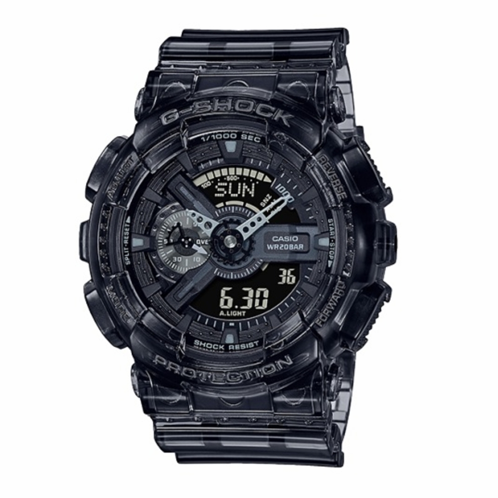 Black resin case and strap. Fixed black resin bezel. Black dial with silver-tone hands and index hour markers. Minute markers around the outer rim. Dial Type: Analog-digital. Quartz movement. Scratch resistant mineral crystal. Solid case back. Round case shape, case size: 55 x 51.2 mm, case thickness: 16.9 mm. Tang clasp. Water resistant at 200 meters / 660 feet. Functions: date, day, hour, minute, second, month, world time, 29 time zones, countdown timer, led light, full auto-calendar (to year 2099), full auto-calendar (to year 2099), 5 daily alarms (with 1 snooze alarm). G-shock Series. Sport watch style. Casio G-Shock Alarm World Time Quartz Analog-Digital Black Dial Mens Watch GA-110SKE-8A.