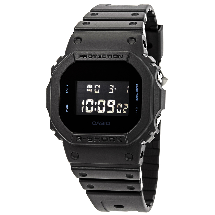 Black resin case with a black resin strap. Fixed black bezel. Digital dial displaying hours, minutes, seconds, date and day of the week. . Dial Type: digital. Complete calendar. Casio Calibre 3229 quartz movement. Scratch resistant mineral crystal. Rectangle case shape. Case dimensions: 48.9 x 42.8 mm. Case thickness: 13.4 mm. Buckle clasp. Water resistant at 200 meters / 660 feet. Functions: date, day, hour, minute, month, second, 1/100-second stopwatch, countdown timer, multi-function alarm. Sport watch style. Watch label: Japan Movt. Casio G-shock Mens Digital Watch DW-5600BB-1CR.