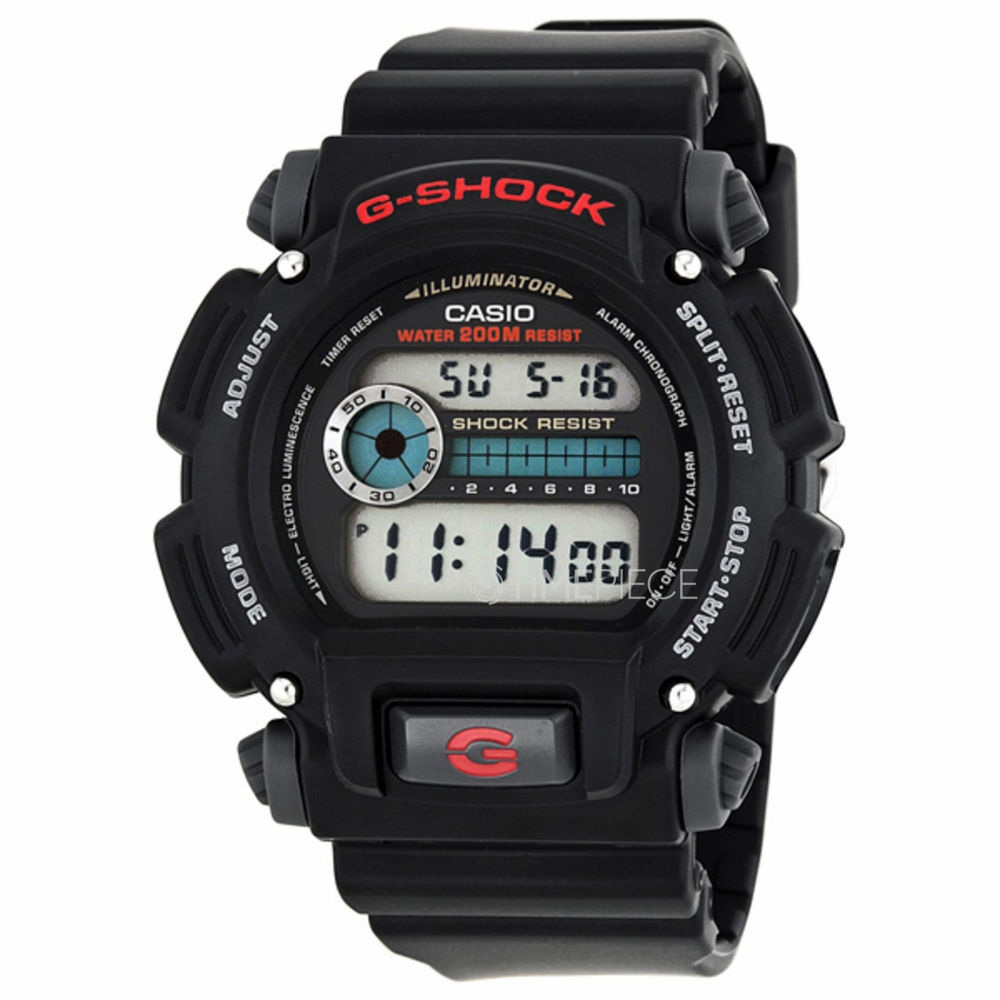 Black resin case with a black resin strap. Fixed bezel. Digital dial. Dial Type: digital. Quartz movement. Scratch resistant mineral crystal. Case diameter: 46 mm. Round case shape. Tang clasp. Water resistant at 200 meters / 660 feet. Functions: hour, minute, second, date, 1/100th second stopwatch, hourly time signal, auto calendar, 12/24 hour formats, countdown timer, daily alarm, el backlight with afterglow. shock resistant.. Sport watch style. Casio G Shock Digital Dial Black Resin Mens Watch DW9052-1V.
