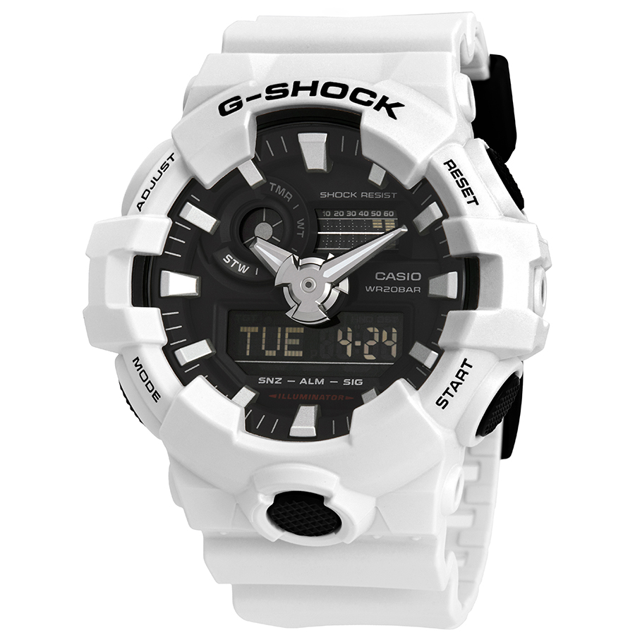 White resin case with a white resin bracelet. Fixed bezel. Black dial with silver-tone hands and index hour markers. Dial Type: Analog-digital. Luminescent hands and markers. Complete calendar. Casio Calibre 5522 quartz movement. Scratch resistant mineral crystal. Round case shape, case size: 57.5 x 53.4 mm, case thickness: 18.4 mm. Tang clasp. Water resistant at 200 meters / 660 feet. Functions: hour, minute, second, shock resistant, world time, 5 alarms, 1/100 second stopwatch, countdown timer. Additional Info: super illuminator led light with afterglow. Watch label: Japan Movt. Casio G-Shock World Time Black Dial Mens Analog-Digital Watch GA-700-7ACR.