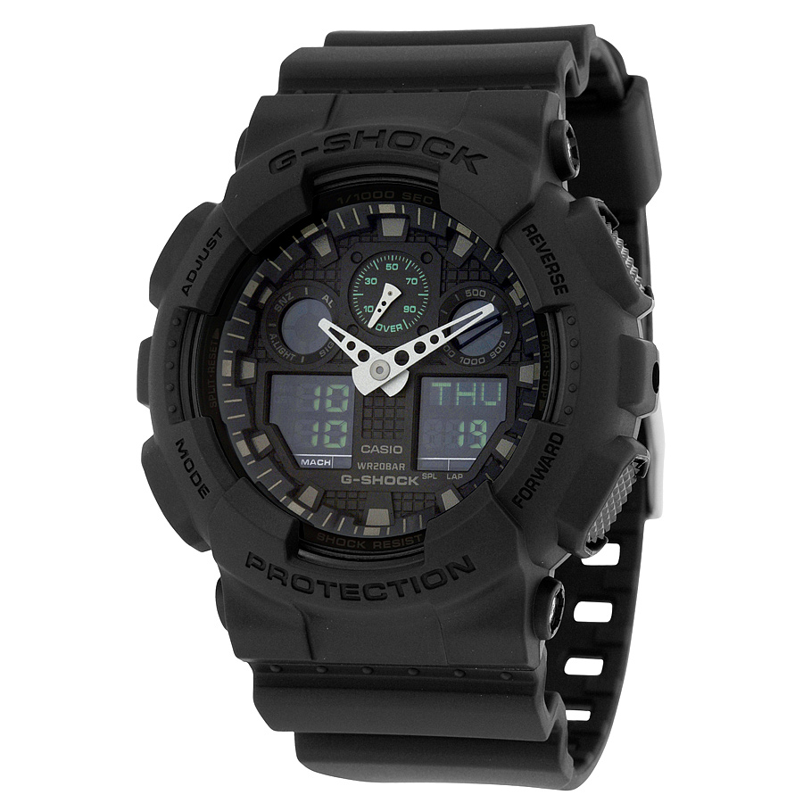Black resin case with a black resin strap. Fixed bezel. Black dial with silver-tone hands and index hour markers. Minute markers around the outer rim. Dial Type: Analog. Perpetual calendar. Quartz movement. Scratch resistant mineral crystal. Solid case back. Case dimensions: 55 mm x 51.2 mm. Case thickness: 16.39 mm. Round case shape. Tang clasp. Water resistant at 200 meters / 660 feet. Functions: hour, minute, second, perpetual calendar, world time, shock resistant, magnetic resistant. Additional Info: 4 daily alarms and 1 snooze alarm,1/1000 second stopwatch, 29 times zones (48 cities + UTC), full auto-calendar (pre-programmed until the year 2099). Sport watch style. Casio G-Shock Black Dial Black Resin Mens Watch GA100MB-1A.