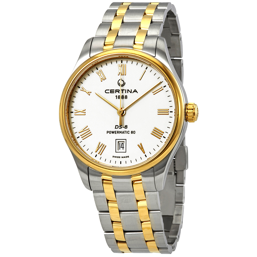 Silver-tone stainless steel case with a two-tone (silver-tone and gold-tone) stainless steel bracelet. Fixed gold-tone stainless steel bezel. White dial with gold-tone hands and Roman numeral hour markers. Minute markers around the outer rim. Dial Type: Analog. Date display at the 6 o'clock position. Certina Calibre Powermatic 80 (ETA C07.111) Automatic movement, based upon ETA 2824-2, containing 23 Jewels, bitting at 21600 vph, and has a power reserve of approximately 80 hours. Scratch resistant sapphire crystal. Transparent case back. Round case shape, case size: 39 mm, case thickness: 10.45 mm. Butterfly clasp. Water resistant at 100 meters / 330 feet. Functions: date, hour, minute, second. Ds-8 Series. Casual watch style. Watch label: Swiss Made. Certina DS-8 Automatic White Dial Mens Watch C033.407.22.013.00.