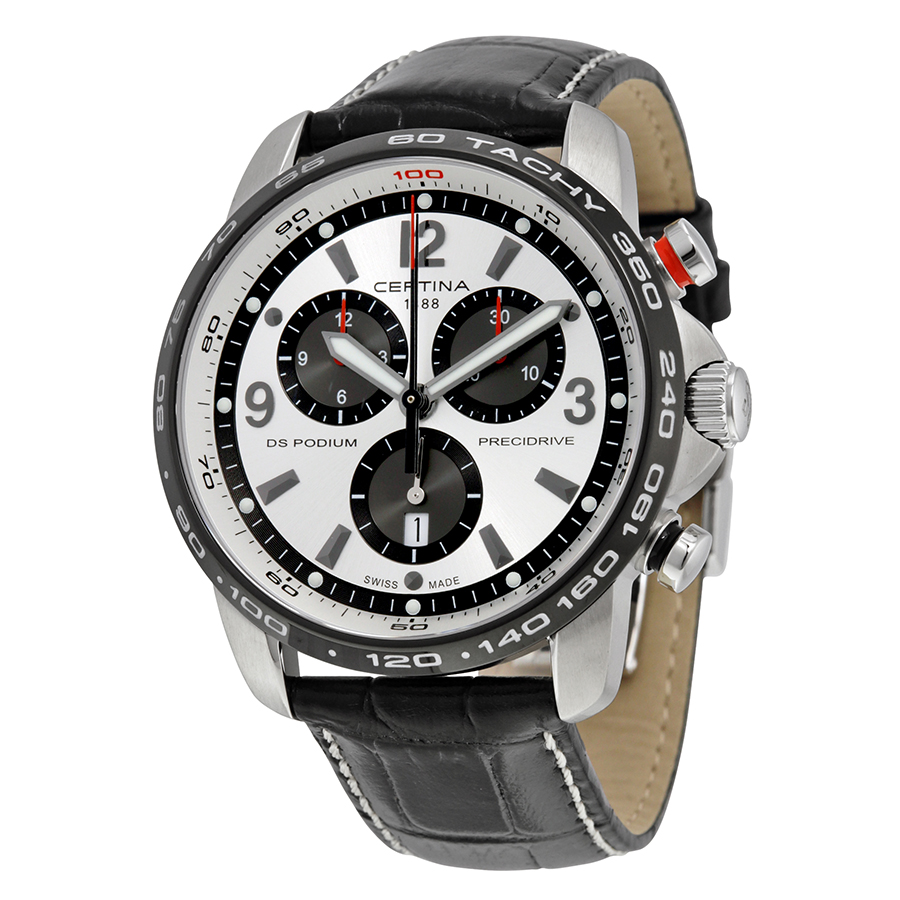 Stainless steel case with a black leather strap. Fixed black PVD bezel showing tachymeter markings. Silver and black dial with luminous hands and index hour markers. Arabic numerals mark the 3, 9 and 12 o'clock positions. Minute markers. 1/100th markings around the outer rim. Dial Type: Analog. Luminescent hands and markers. Date display at the 6 o'clock position. Chronograph - three sub-dials displaying: 60 second, 30 minute and 12 hour. Quartz Chronographs movement. Scratch resistant sapphire crystal. Screw down crown. Solid case back. Case size: 44 mm. Case thickness: 13.5 mm. Round case shape. Band width: 20 mm. Tang clasp. Water resistant at 200 meters / 660 feet. Functions: chronograph, date, hour, minute, second. Casual watch style. Watch label: Swiss Made. Certina DS Podium Big Size Chronograph Mens Watch C0016471603700.