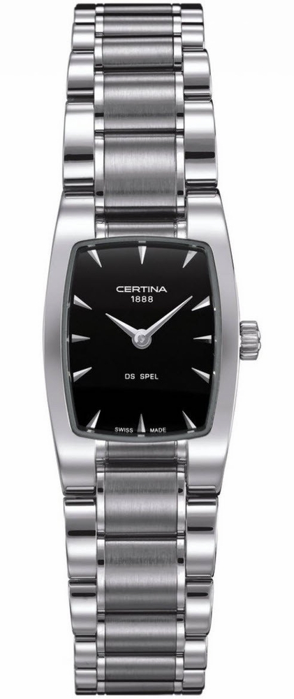 Stainless steel case with a stainless steel bracelet. Fixed stainless steel bezel. Black dial with silver-tone hands and index hour markers. Dial Type: Analog. ETA caliber 901.001 quartz movement. Scratch resistant sapphire crystal. Pull / push crown. Solid case back. Tonneau case shape. Case dimensions: 25 mm x 20 mm. Case thickness: 6.67 mm. Deployment clasp with a push button release. Water resistant at 100 meters / 330 feet. Functions: hour, minute. Ds Mini Spel Lady Shape Series. Dress watch style. Watch label: Swiss Made. Certina DS Mini Spel Lady Shape Stainless Steel Ladies Watch C0121091105100.