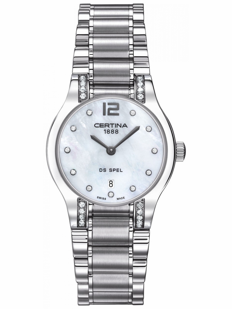 Stainless steel case set with diamonds with a stainless steel bracelet. Fixed stainless steel bezel. White mother of pearl dial with silver-tone hands and diamond hour markers. An Arabic numeral appears at the 12 o'clock position. Dial Type: Analog. Date display above the 6 o'clock position. ETA caliber 956.112 quartz movement. Scratch resistant sapphire crystal. Pull / push crown. Solid case back. Round case shape. Case size: 30 mm. Case thickness: 7 mm. Fold over clasp with a push button release. Water resistant at 100 meters / 330 feet. Functions: date, hour, minute. Ds Spel Lady Round Series. Dress watch style. Watch label: Swiss Made. Certina DS Spel Lady Round Stainless Steel Diamond Ladies Watch C0122096111600.