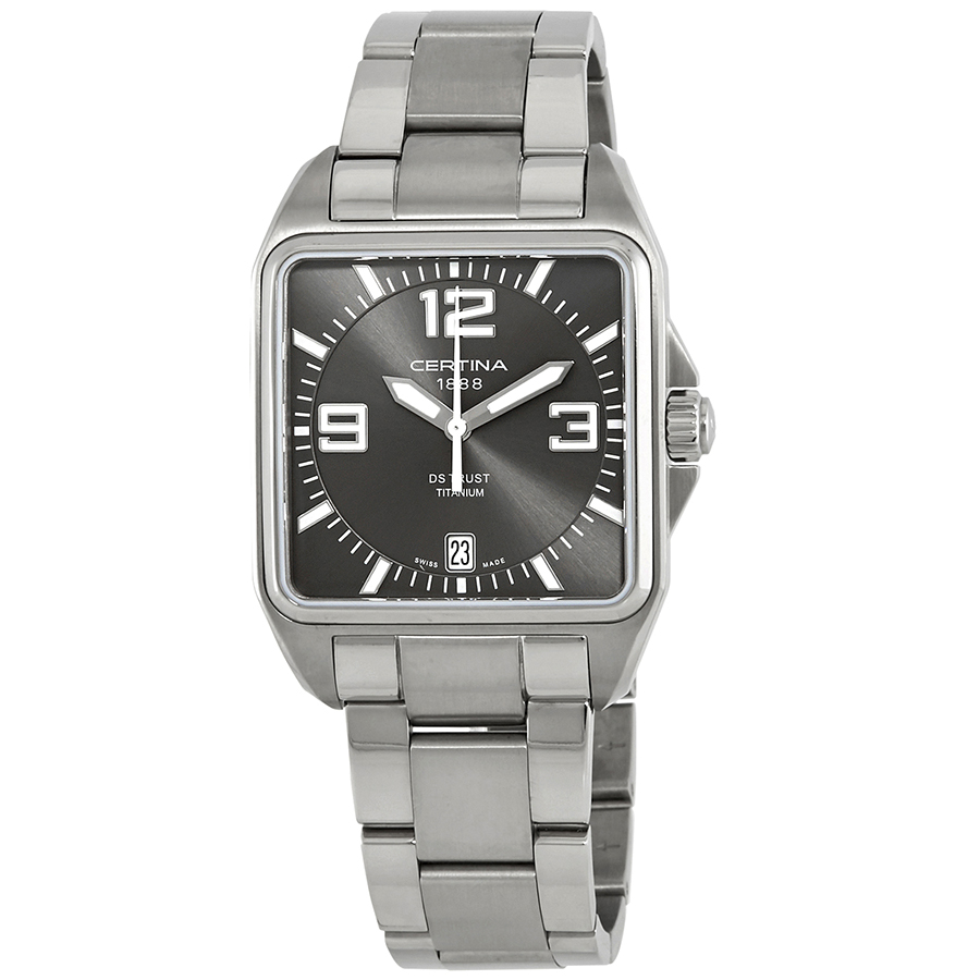 Silver-tone titanium case with a two-tone (grey and silver-tone) titanium bracelet. Fixed grey titanium bezel. Grey dial with silver-tone hands and Arabic numeral and index hour markers. Minute markers around the outer rim. Dial Type: Analog. Luminescent hands and markers. Date display at the 6 o'clock position. ETA Caliber 955.112 quartz movement. Scratch resistant sapphire crystal. Case size: 34 mm. Case thickness: 8.6 mm. Rectangle case shape. Deployment clasp. Water resistant at 100 meters / 330 feet. Functions: date, hour, minute, second, battery eol indicator. Casual watch style. Watch label: Swiss Made. Certina DS Trust Titanium Watch C019.510.44.087.00.