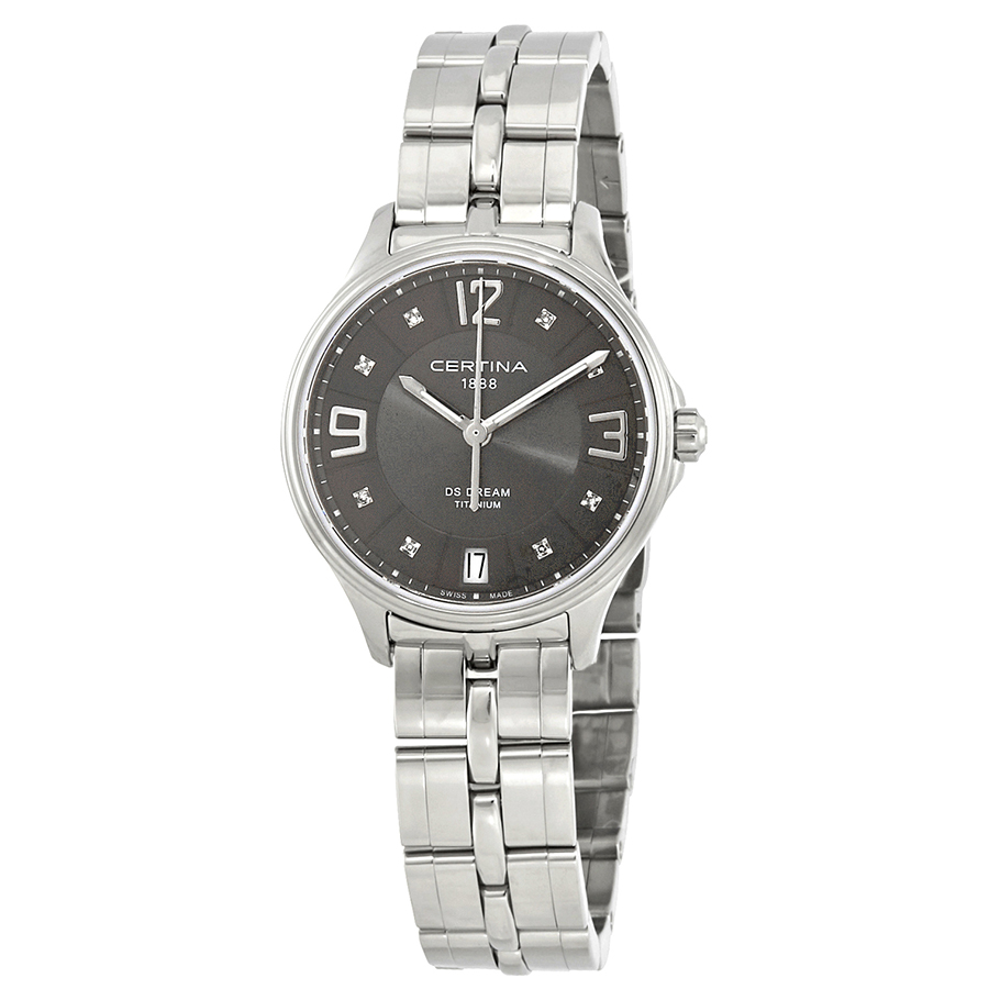Stainless steel case with a stainless steel bracelet. Fixed stainless steel bezel. Grey dial with luminous silver-tone hands and diamond hour markers. Arabic numerals mark the 3, 9 and 12 o'clock positions. Minute markers around the outer rim. Dial Type: Analog. Luminescent hands. Date display at the 6 o'clock position. ETA caliber F06.111 quartz movement. Scratch resistant sapphire crystal. Pull / push crown. Solid case back. Round case shape. Case size: 30.50 mm. Case thickness: 7.4 mm. Band width: 14 mm. Deployment clasp with a push button release. Water resistant at 100 meters / 330 feet. Functions: date, hour, minute, second. Casual watch style. Watch label: Swiss Made. Certina DS Dream Diamond Grey Dial Ladies Watch C021.210.44.086.00.