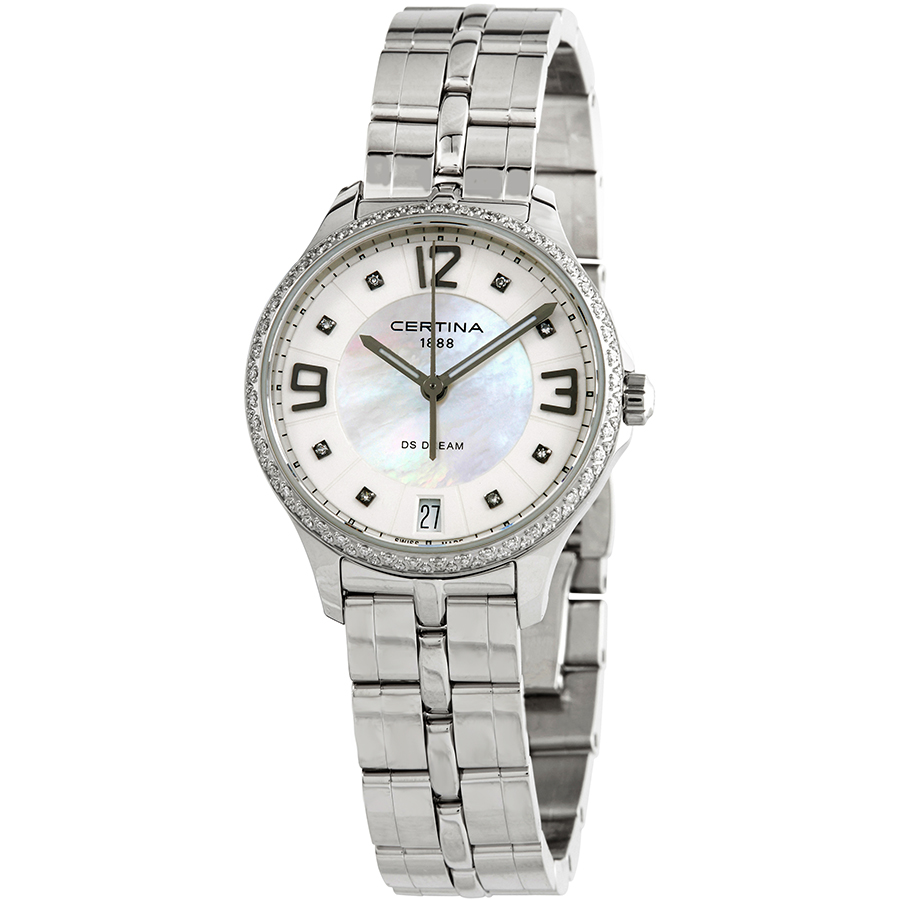 Stainless steel case with a silver-tone stainless steel bracelet. Fixed-diamond set bezel. White mother of pearl dial with diamond and Arabic hour markers. Minute markers around the outer rim. Dial Type: Analog. Date display at the 6 o'clock position. ETA Caliber F06.111 quartz movement. Scratch resistant sapphire crystal. Solid case back. Round case shape. Case size: 30.50 mm. Deployment with push button release clasp. Water resistant at 100 meters / 330 feet. Functions: date, hour, minute, second. Additional Info: 98 diamonds. Dress watch style. Watch label: Swiss Made. Certina DS Dream Stainless Steel Diamond Ladies Watch C021.210.61.116.00.