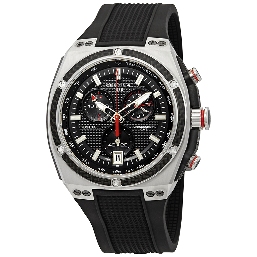 Stainless steel case with a black rubber strap. Fixed black bezel. Black dial with luminous hands and index hour markers. Minute markers around the outer rim. Dial Type: Analog. Date display at the 6 o'clock position. Chronograph - three sub-dials displaying: 60 second, 12, hour, 24 hour. ETA Caliber G10.961 quartz movement. Scratch resistant sapphire crystal. Screw down crown. Solid case back. Tonneau case shape. Case size: 46 mm. Tang clasp. Water resistant at 200 meters / 660 feet. Functions: GMT, second time zone, hour, minute, second, chronograph, date. Sport watch style. Watch label: Swiss Made. Certina DS Eagle Chronograph GMT Black Rubber Mens Watch C0237392705100.