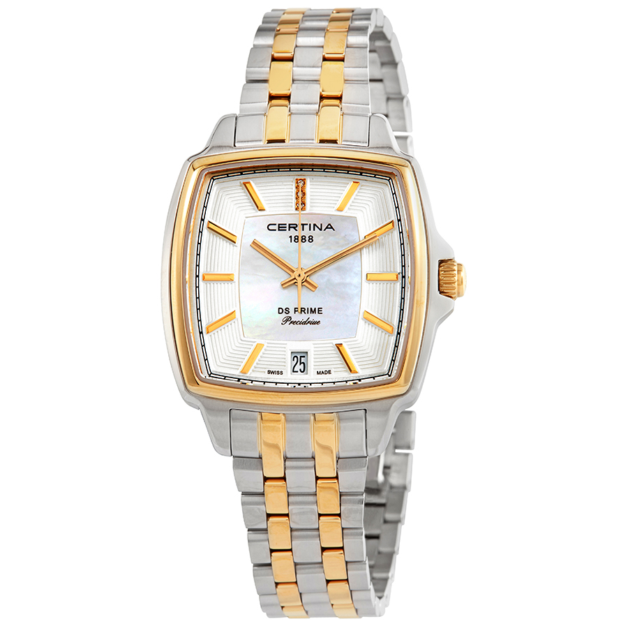 Two-tone stainless steel case with a two-tone (silver-tone and gold-tone) stainless steel bracelet. Fixed bezel. Mother of pearl dial with gold-tone hands and index hour markers. Dial Type: Analog. Date display at the 6 o'clock position. ETA Caliber F06.411 quartz movement. Scratch resistant sapphire crystal. Solid case back. Square case shape. Case size: 32.75 mm. Deployment with push button release clasp. Water resistant at 100 meters / 330 feet. Functions: date, hour, minute, second. Additional Info: 3 diamonds at 12 o'clock. Dress watch style. Watch label: Swiss Made. Certina DS Prime Shape Mother Of Pearl Dial Ladies Two Tone Watch C028.310.22.116.00.