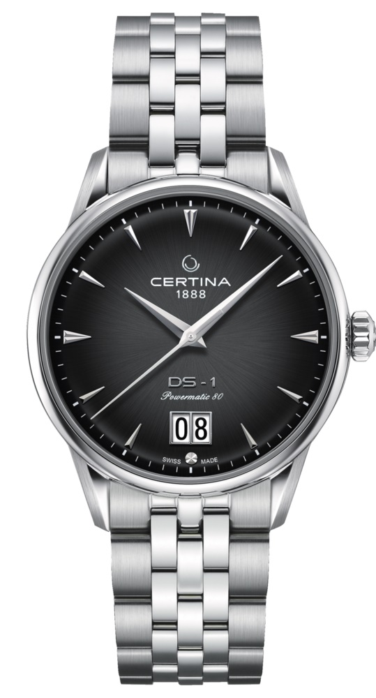 Stainless steel case with a stainless steel bracelet. Fixed stainless steel bezel. Black dial with silver-tone hands and index hour markers. Minute markers around the outer rim. Dial Type: Analog. Date display at the 6 o'clock position. Powermatic 80.651 automatic movement with an 80-hour power reserve. Scratch resistant sapphire crystal. Transparent case back. Round case shape, case size: 41 mm, case thickness: 11.9 mm. Band width: 20 mm. Fold over clasp. Water resistant at 100 meters / 330 feet. Functions: date, hour, minute, second. Ds-1 Big Date Series. Luxury watch style. Watch label: Swiss Made. Certina DS-1 Big Date Automatic Black Dial Mens Watch C029.426.11.051.00.