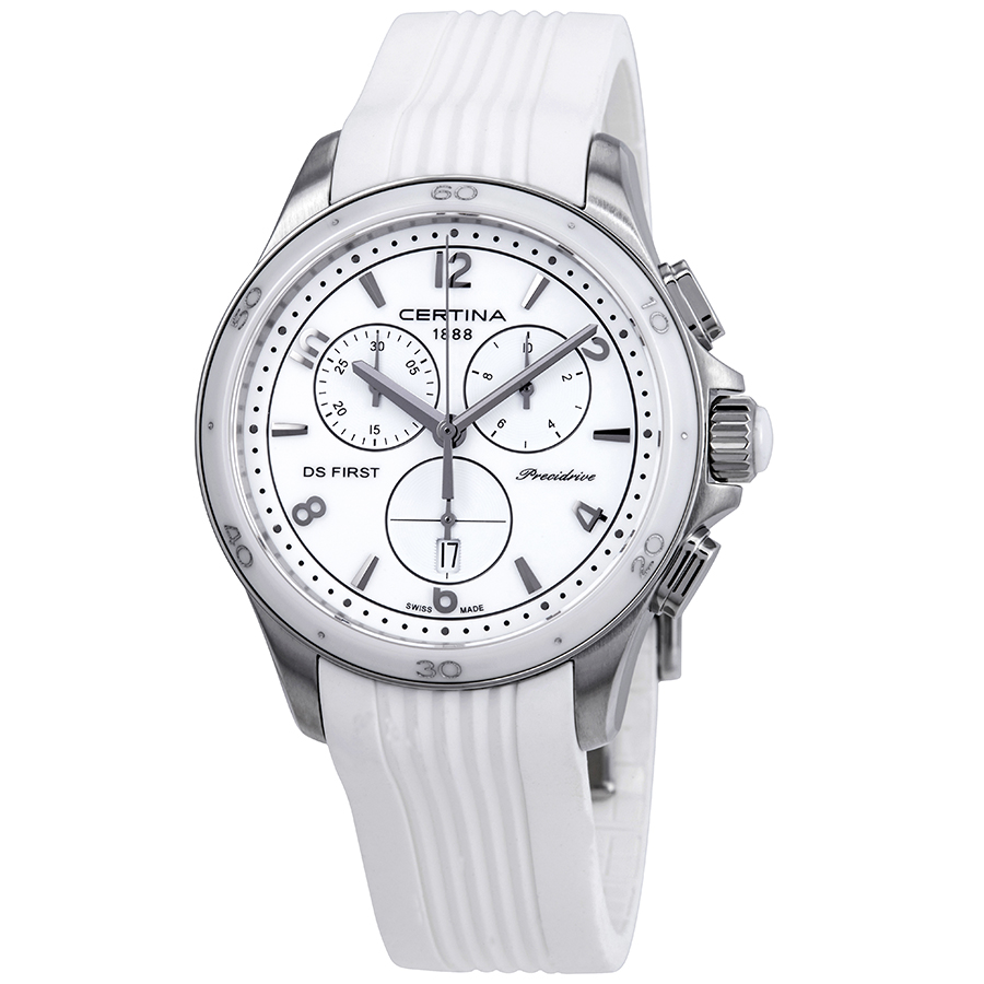 Stainless steel case with a white rubber strap. Fixed stainless steel bezel with a white ceramic top ring. White dial with silver-tone hands and alternating index and Arabic numeral hour markers. Minute markers around the outer rim. Dial Type: Analog. Date display at the 6 o'clock position. Chronograph - three sub-dials displaying: 60 second, 30 minute and 1/10th of a second. ETA caliber G15.212 AA quartz movement. Scratch resistant sapphire crystal. Solid case back. Round case shape. Case size: 38 mm. Case thickness: 11.8 mm. Band width: 20 mm. Tang clasp. Water resistant at 100 meters / 330 feet. Functions: chronograph, date, hour, minute, second. Sport watch style. Watch label: Swiss Made. Certina DS First Lady Chronograph White Dial Ladies Watch C030.217.17.017.00.