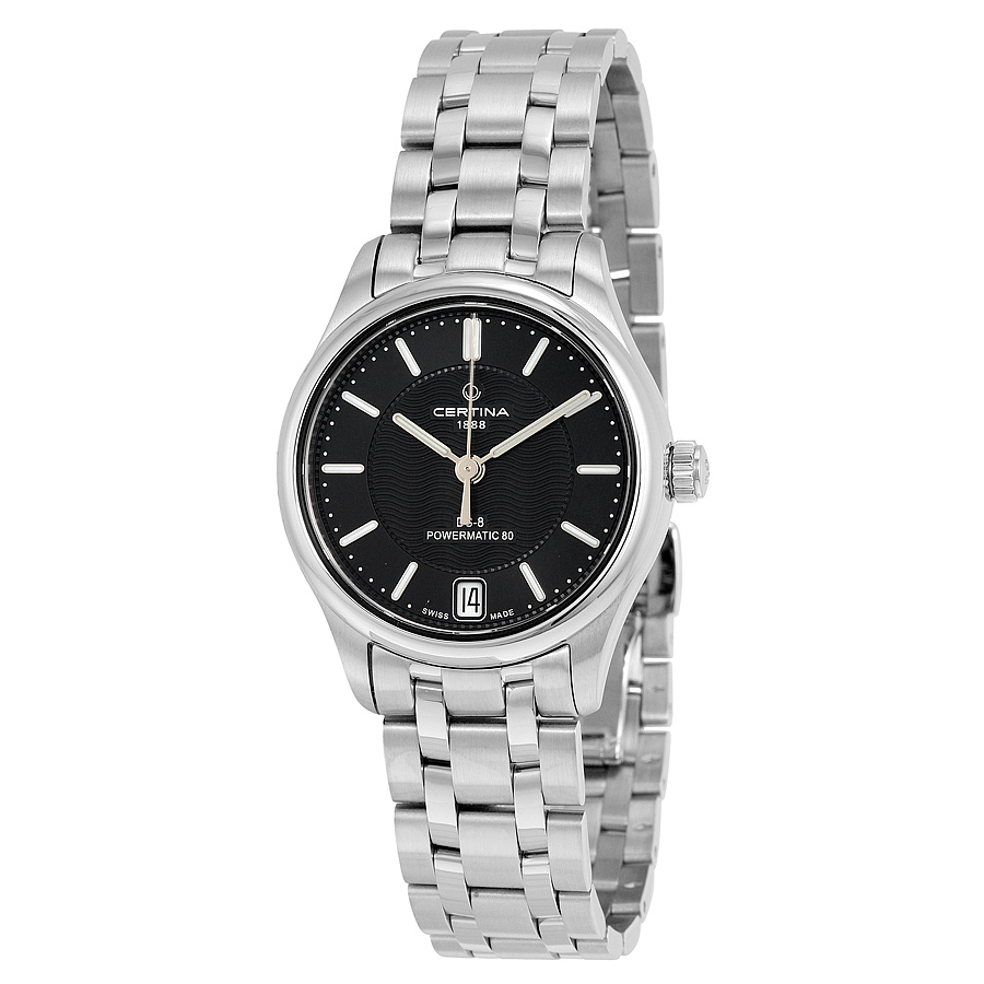 Stainless steel case with a stainless steel bracelet. Fixed stainless steel bezel. Black dial with luminous silver-tone hands and index hour markers. Minute markers around the outer rim. Dial Type: Analog. Luminescent hands and markers. Date display at the 6 o'clock position. Certina calibre Powermatic 80 (ETA C07.111) automatic movement, based upon ETA 2824-2, containing 23 Jewels, bitting at 21600 vph, and has a power reserve of approximately 80 hours. Scratch resistant sapphire crystal. Pull / push crown. Transparent case back. Round case shape. Case size: 31.50 mm. Case thickness: 9.8 mm. Band width: 22 mm. Fold over clasp with a push button release. Water resistant at 100 meters / 330 feet. Functions: date, hour, minute, second. Ds-8 Powermatic 80 Series. Casual watch style. Watch label: Swiss Made. Certina DS- 8 Automatic Black Dial Ladies Watch C0332071105100.