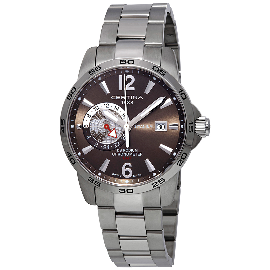 Grey titanium case with a grey titanium bracelet. Fixed arabic numeral grey titanium bezel. Grey dial with silver-tone hands and Arabic numeral and index hour markers. Minute markers around the outer rim. Dial Type: Analog. Luminescent hands. Date display at the 3 o'clock position. One subdial displaying: 24 hour. ETA Caliber F06.421 quartz movement. Scratch resistant sapphire crystal. Solid case back. Round case shape, case size: 41 mm, case thickness: 10.4 mm. Butterfly clasp. Water resistant at 100 meters / 330 feet. Functions: date, GMT, second time zone, hour, minute, second, battery eol indicator. Ds Podium Series. Casual watch style. Watch label: Swiss Made. Certina DS Podium Grey Dial Mens Watch C034.455.44.087.00.