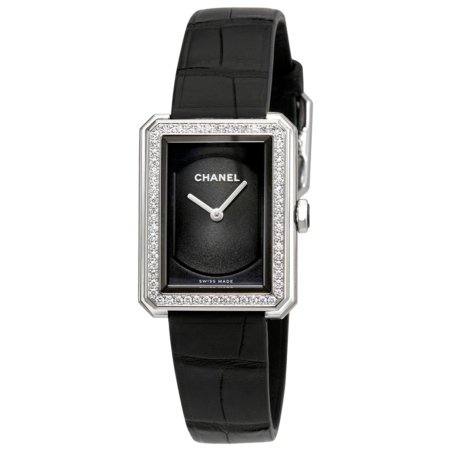 Stainless steel case with a black alligator leather strap. Fixed stainless steel bezel set with diamonds. Black guilloche dial with silver-tone hands. No markers. Dial Type: Analog. Quartz movement. Scratch resistant sapphire crystal. Pull / push crown. Solid case back. Case dimensions: 21.50 mm x 27.90 mm. Case thickness: 6.23 mm. Rectangle case shape. Tang clasp. Water resistant at 30 meters / 100 feet. Functions: hour, minute. Luxury watch style. Watch label: Swiss Made. Chanel Boy-Friend Black Guilloche Dial Ladies Watch H4883.
