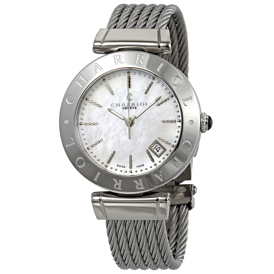 Silver-tone stainless steel case with a silver-tone stainless steel chevron cable bracelet. Fixed silver-tone stainless steel bezel. Mother of pearl dial with silver-tone hands and index hour markers. Dial Type: Analog. Luminescent hands. Date display between 4 and 5 o'clock position. Quartz movement. Scratch resistant sapphire crystal. Pull / push crown. Solid case back. Round case shape, case size: 34 mm, case thickness: 8 mm. Band width: 18 mm, band length: 7 inches. Deployment with push button clasp. Water resistant at 30 meters / 100 feet. Functions: date, hour, minute, second. Dress watch style. Watch label: Swiss Made. Charriol Alexandre Ladies Watch AMS.51.002.