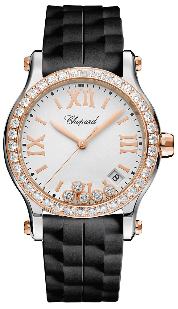 Stainless steel case with a black rubber strap. Fixed 18kt rose gold bezel set with diamonds. White dial (with five floating diamonds) with rose gold hands and index hour markers. Roman numerals appear at the 3, 6, 9 and 12 o'clock positions. Minute markers around the outer rim. Dial Type: Analog. Date display between the 4 and 5 o'clock positions. Quartz movement. Scratch resistant sapphire crystal. Pull / push crown. Solid case back. Round case shape. Case size: 36 mm. Tang clasp. Water resistant at 30 meters / 100 feet. Functions: hour, minute, second. Happy Sport Series. Sport watch style. Watch label: Swiss Made. Chopard Happy Sport Quartz Diamond White Dial Ladies Watch 278582-6003.