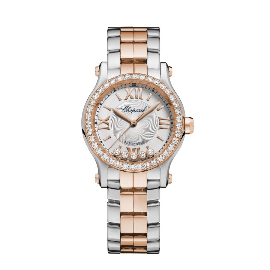 Silver-tone stainless steel case with a two-tone (silver-tone and rose gold-tone) 18kt rose gold and stainless steel bracelet. Fixed rose gold-tone bezel with diamond set 18kt rose gold. Silver-tone dial with rose gold-tone hands and Roman numeral & index hour markers. Minute markers around the outer rim. Dial Type: Analog. 5 floating diamonds subdials. Chopard Calibre 09.01-C Automatic movement, containing 27 Jewels, bitting at 25200 vph, and has a power reserve of approximately 42 hours. Scratch resistant sapphire crystal. Transparent see through case back. Round case shape, case size: 30 mm, case thickness: 11.23. Butterfly clasp. Water resistant at 30 meters / 100 feet. Functions: hour, minute, second, chronometer. Additional Info: 1.26 ctw white diamond. Happy Sport Series. Dress watch style. Watch label: Swiss Made. Chopard Happy Sport Automatic Diamond Silver Dial Ladies Watch 278573-6016.