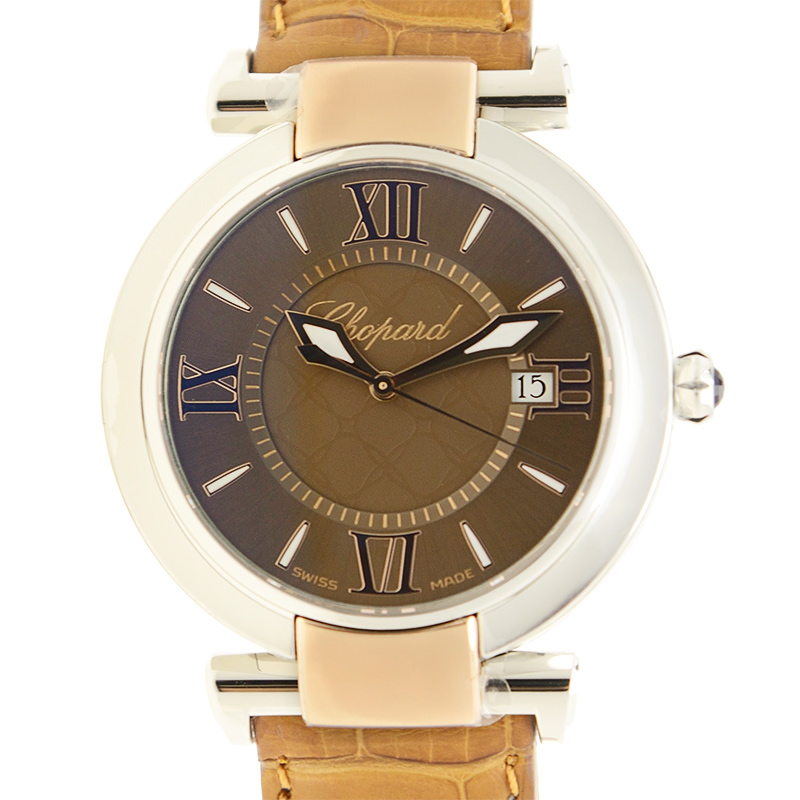 Silver-tone stainless steel case with a brown alligator leather strap. Fixed stainless steel bezel. Brown dial with index hour markers. Roman numerals mark the 3, 6, 9 and 12 o'clock positions. minute markers around an inner ring. Dial Type: Analog. Date display at the 3 o'clock position. Quartz movement. Scratch resistant sapphire crystal. Pull / push crown. Solid case back. Round case shape, case size: 36 mm, case thickness: 9 mm. Tang clasp. Water resistant at 50 meters / 165 feet. Functions: date, hour, minute, second. Additional Info: case features 18k rose gold center lugs. Luxury watch style. Watch label: Swiss Made.