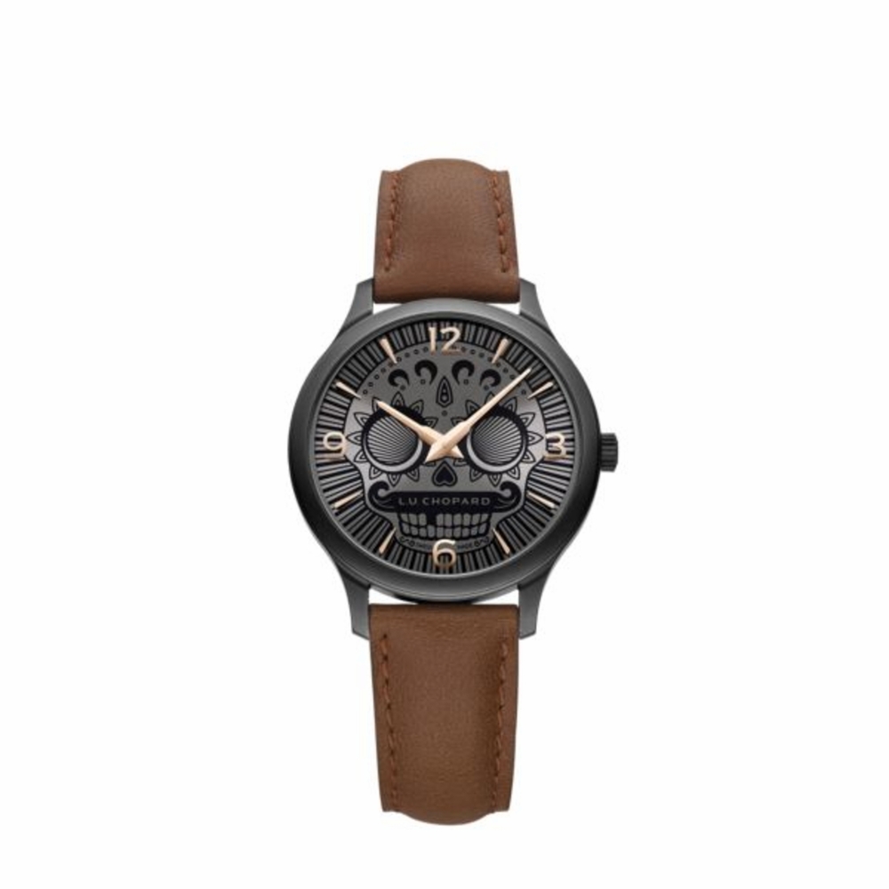 Black DLC stainless steel case with a brown calfskin leather strap. Fixed black stainless steel bezel. Grey dial with rose gold-tone hands and Arabic numeral, index hour markers. Dial Type: Analog. Chopard Calibre L.U.C 96.53-L Automatic movement, containing 27 Jewels, bitting at 28800 vph, and has a power reserve of approximately 58 hours. Anti-reflective scratch resistant sapphire crystal. Pull / push crown. Transparent case back. Round case shape, case size: 40 mm, case thickness: 7.2 mm. Tang buckle clasp. Water resistant at 30 meters / 100 feet. Functions: hour, minute. L.u.c. Series. Luxury watch style. Watch label: Swiss Made. Chopard L.U.C. Automatic Grey Dial Mens Watch 168592-3004.