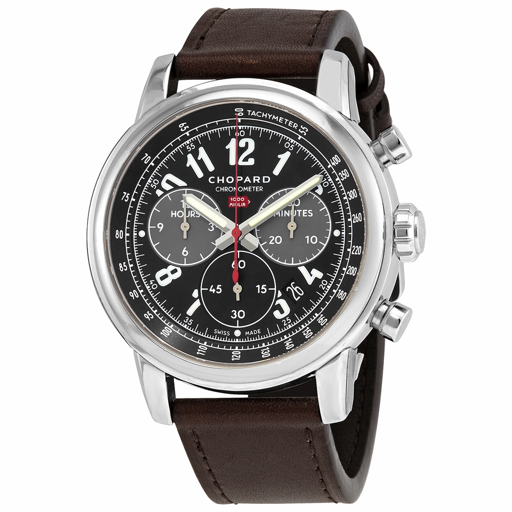 Stainless steel case with a matt brown (vintage) leather strap. Fixed stainless steel bezel. Black dial with silver-tone hands and Arabic numeral hour markers. Tachymeter. Dial Type: Analog. Luminescent hands and markers. Date display between the 4 and 5 o'clock positions. Chronograph - three sub-dials displaying: 60 second, 30 minute and 12 hours. Chopard calibre 03.05-C automatic movement, containing 45 Jewels, bitting at 28800 vph, and has a power reserve of approximately 60 hours. Scratch resistant sapphire crystal. Screw down crown. Transparent case back. Round case shape. Case size: 46 mm. Band width: 22 mm / 20 mm. Fold over push button clasp. Water resistant at 50 meters / 165 feet. Functions: chronograph, date, hour, minute, second. Additional Info: limited edition of 1000 pieces. Mille Miglia 2016 Xl Race Edition Series. Luxury watch style. Watch label: Swiss Made. Chopard Mille Miglia 2016 XL Race Edition Chronograph Automatic Black Dial Mens Watch 168580-3001.