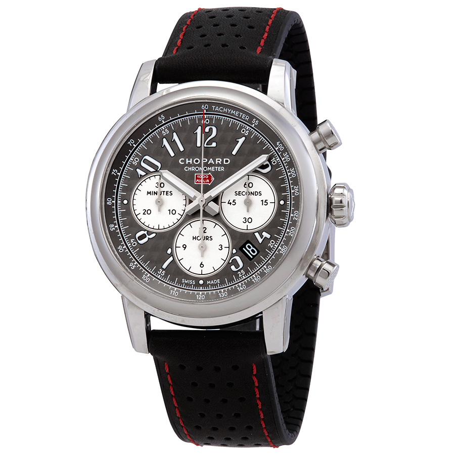 Mille Miglia 2018 Race Edition Stainless steel case with a black rubber strap. Fixed stainless steel bezel. Grey dial with index hour markers. Minute markers. tachymeter markings around the outer rim. Dial Type: Analog. Luminescent hands and markers. Date display between 4 and 5 o'clock position. Chronograph - three sub-dials displaying: 60 second, 30 minute and 12 hour. Automatic movement. Scratch resistant sapphire crystal. Screw down crown. Transparent case back. Round case shape, case size: 42 mm, case thickness: 12.67 mm. Tang clasp. Water resistant at 50 meters / 165 feet. Functions: chronograph, tachymeter, date, hour, minute, second. Luxury watch style. Watch label: Swiss Made.