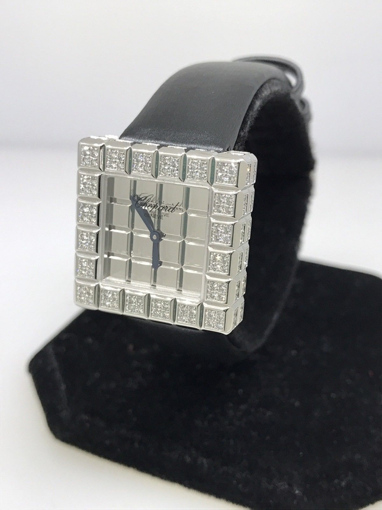 18 carat white gold case with a black satin bracelet. Pave set diamond bezel. Mirror dial with blue hands and diamond hour markers. Dial Type: Analog. Quartz movement. Scratch resistant sapphire crystal. Solid case back. Case diameter: 25 mm. Case thickness: 8 mm. Square case shape. Band length: 6 inches. Water resistant at 30 meters / 100 feet. Functions: hour, minute. Luxury watch style. Watch label: Swiss Made. Item Variations: 136815 1001, 136815.1001, 1368151001. Chopard Ice Cube Mirror Dial Square Ladies Quartz Watch 136815-1001.