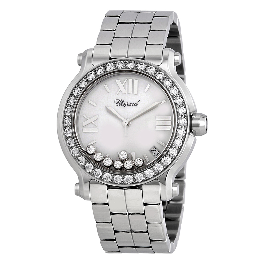 Stainless steel case with a silver stainless steel bracelet. Fixed bezel. White dial with silver-tone hands and Roman-index hour markers. Date display between 4 and 5 o'clock position. Quartz movement. Scratch resistant sapphire crystal. Pull / push crown. Solid case back. Case diameter: 36 mm. Round case shape. Hidden fold over clasp. Water resistant at 30 meters / 100 feet. Functions: date, hour, minute, second. Luxury watch style. Watch label: Swiss Made. Chopard Happy Sport White Dial Diamond Ladies Watch 278477-3008.