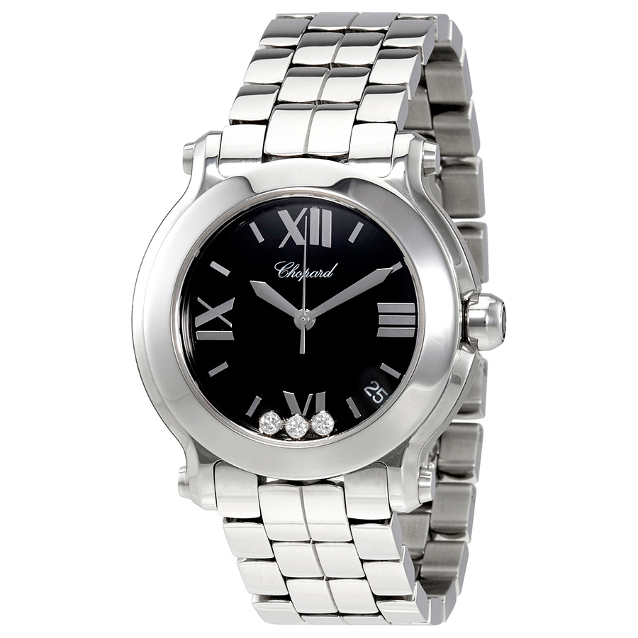 Stainless steel case with a stainless steel bracelet. Fixed stainless steel bezel. Black dial (with three floating diamonds) with silver-tone hands and index hour markers. Roman numerals mark the 3, 6, 9 and 12 o'clock positions. Dial Type: Analog. Date display between the 4 and 5 o'clock positions. Quartz movement. Scratch resistant sapphire crystal. Solid case back. Case size: 36 mm. Case thickness: 11 mm. Round case shape. Band width: 18 mm. Hidden fold over clasp. Water resistant at 30 meters / 100 feet. Functions: hour, minute, second, date. Luxury watch style. Watch label: Swiss Made. Item Variations: 278477 3014, 278477.3014, 2784773014. Chopard Happy Sport Black Dial with Three Floating Diamonds Ladies Watch 278477-3014.