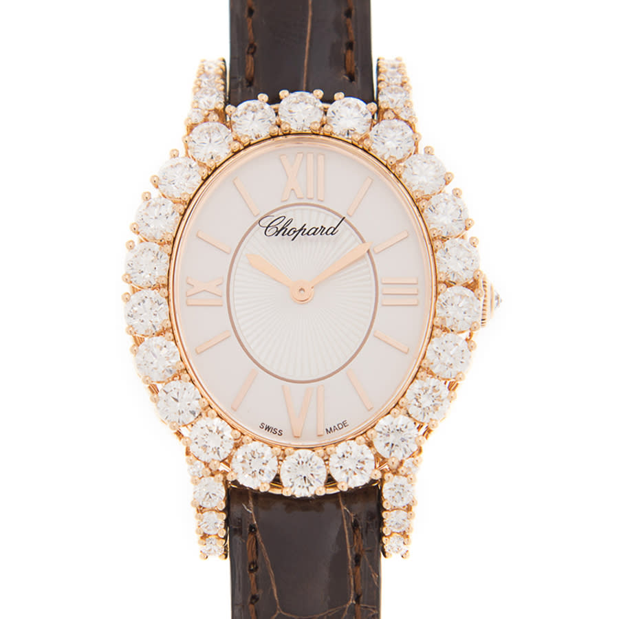 18kt rose gold case with a brown leather strap. Fixed prong-setting with 38 diamonds = 4,63 cts bezel. White dial with gold-tone hands and Roman numeral hour markers. Dial Type: Analog. Hand wind movement with a 30-hour power reserve. Scratch resistant sapphire crystal. Solid case back. Oval case shape. Case size: 29.40 mm x 34.20 mm. Tang clasp. Functions: hour, minute. Additional Info: original box, international warranty card, manual (complete accessories). Luxury watch style. Watch label: Swiss Made. Chopard LHeure du Diamant Hand Wind Diamond White Dial Unisex Watch 139384-5104.