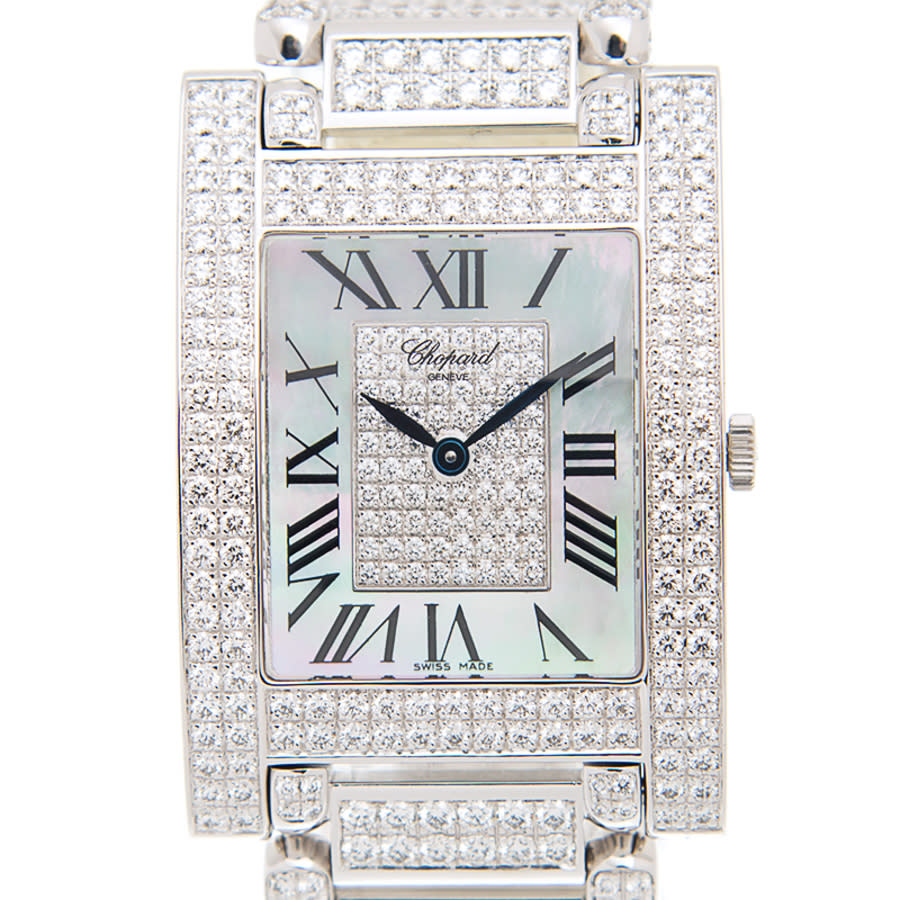 Silver-tone 18kt white gold case with a silver-tone diamond set band. Fixed silver-tone bezel with diamond set. Diamond dial with blue sword-shaped hands and Roman numeral hour markers. Dial Type: Analog. Quartz movement. Scratch resistant sapphire crystal. Pull / push crown. Solid case back. Rectangle case shape, case size: 28 mm, case thickness: 8.27 mm. Hidden clasp. Functions: hour, minute. Additional Info: original box, international warranty card, manual (complete accessories). Happy Series. Luxury watch style. Watch label: Swiss Made. Chopard Happy Quartz Diamond Unisex Watch 143483-1002.