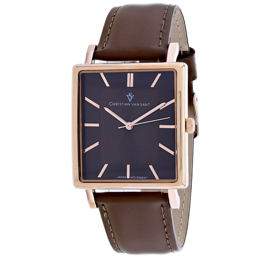 Rose gold-tone stainless steel case with a brown leather strap. Fixed rose gold-tone stainless steel bezel. Brown dial with rose gold-tone hands and index hour markers. Dial Type: Analog. Quartz movement. Scratch resistant mineral crystal. Square case shape, case size: 48 mm. Band width: 20 mm. Buckle clasp. Water resistant at 30 meters / 100 feet. Functions: hour, minute, second. Ace Series. Fashion watch style. Watch label: Japan Movt. Christian Van Sant Ace Quartz Brown Dial Mens Watch CV0435.
