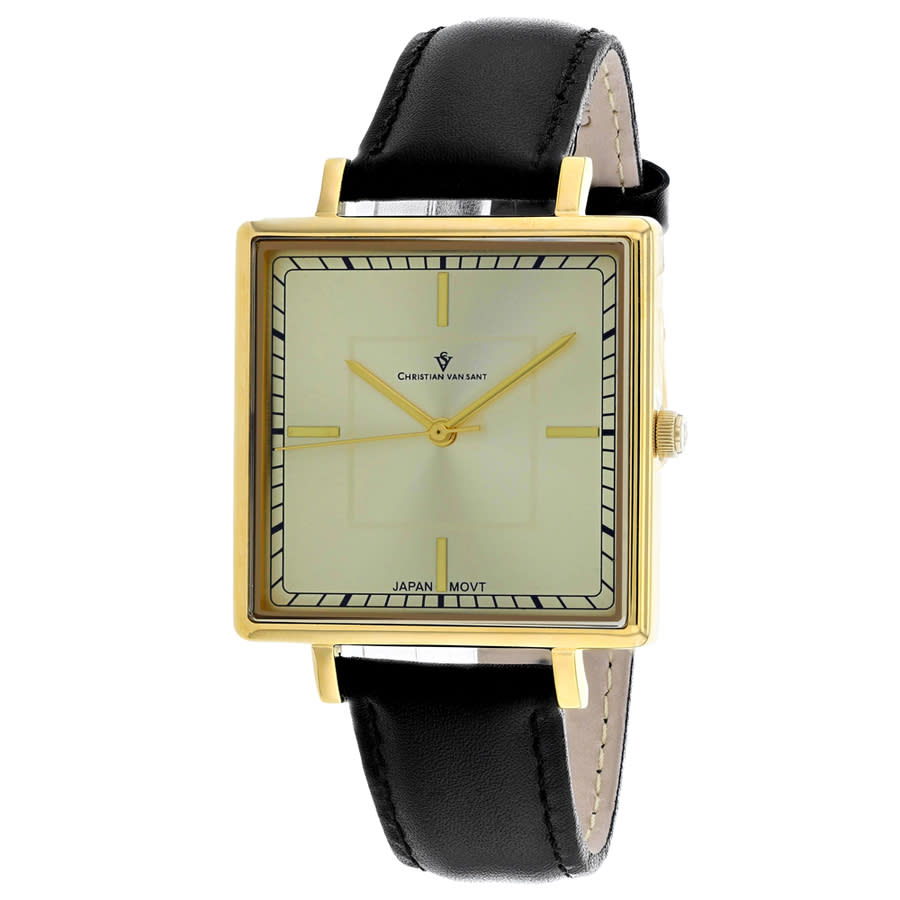Yellow gold-tone stainless steel case with a black leather strap. Fixed yellow gold-tone bezel. Gold dial with yellow gold-tone hands and index hour markers. Gold-tone index markers at the 3, 6, 9 and 12 o'clock positions. Minute markers around the outer rim. Dial Type: Analog. Quartz movement. Scratch resistant mineral crystal. Pull / push crown. Square case shape. Case size: 48 mm. Case thickness: 8 mm. Band width: 18 mm. Tang clasp. Water resistant at 30 meters / 100 feet. Functions: hour, minute, second. Callista Series. Fashion watch style. Watch label: Japan Movt. Christian Van Sant Callista Quartz Gold Dial Ladies Watch CV0413.