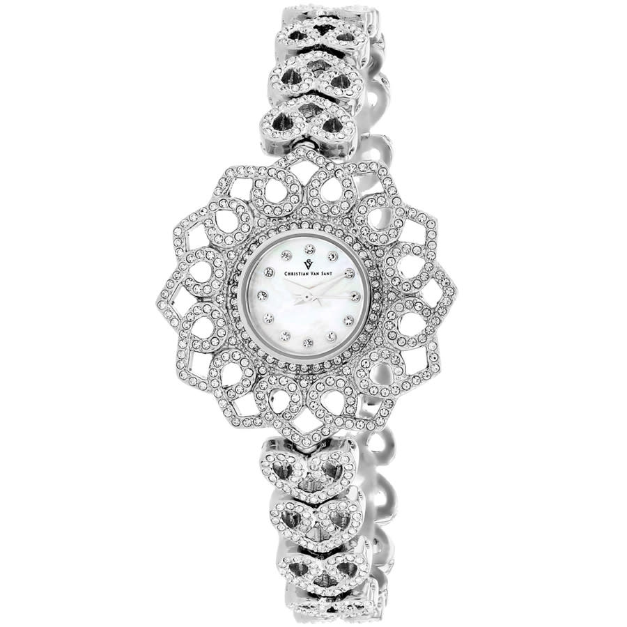 Silver-tone brass case with a silver-tone stainless steel bracelet. Fixed silver-tone stainless steel bezel. Mother of pearl dial with silver-tone hands and index hour markers. Dial Type: Analog. Quartz movement. Scratch resistant mineral crystal. Round case shape, case size: 38 mm. Band width: 12 mm. Jewelry clasp. Water resistant at 30 meters / 100 feet. Functions: hour, minute, second. Chantilly Series. Fashion watch style. Christian Van Sant Chantilly Quartz Ladies Watch CV4810.