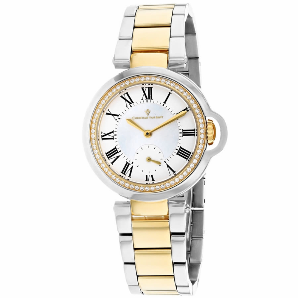 Silver-tone stainless steel case with a two-tone (silver-tone and gold-tone) stainless steel bracelet. Fixed yellow gold-tone stainless steel bezel. Mother of pearl dial with yellow gold-tone hands and Roman numeral hour markers. Minute scale around the inner rim. Dial Type: Analog. Quartz movement. Scratch resistant mineral crystal. Round case shape, case size: 35 mm, case thickness: 9 mm. Band width: 19 mm, band length: 7.5 inches. Fold over clasp with a safety release. Water resistant at 3 meters / 10 feet. Functions: hour, minute, second. Cybele Series. Fashion watch style. Christian Van Sant Cybele Quartz Ladies Watch CV0233.