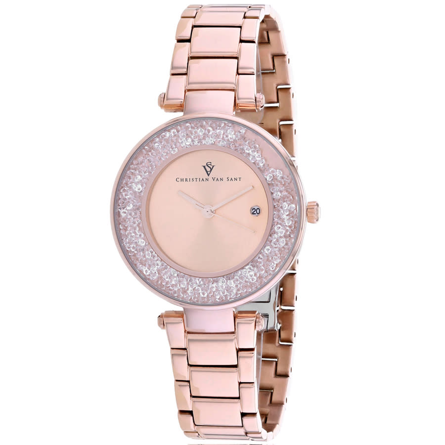 Rose gold-tone stainless steel case and bracelet. Fixed rose gold-tone bezel. Rose dial with rose gold-tone hands. No markers. Dial Type: Analog. Date display at the 3 o'clock position. Quartz movement. Scratch resistant mineral crystal. Pull / push crown. Solid case back. Round case shape. Case size: 34 mm. Case thickness: 8 mm. Band width: 16 mm. Fold over clasp. Water resistant at 30 meters / 100 feet. Functions: date, hour, minute, second. Dazzle Series. Fashion watch style. Christian Van Sant Dazzle Quartz Rose Gold Dial Ladies Watch CV1214.