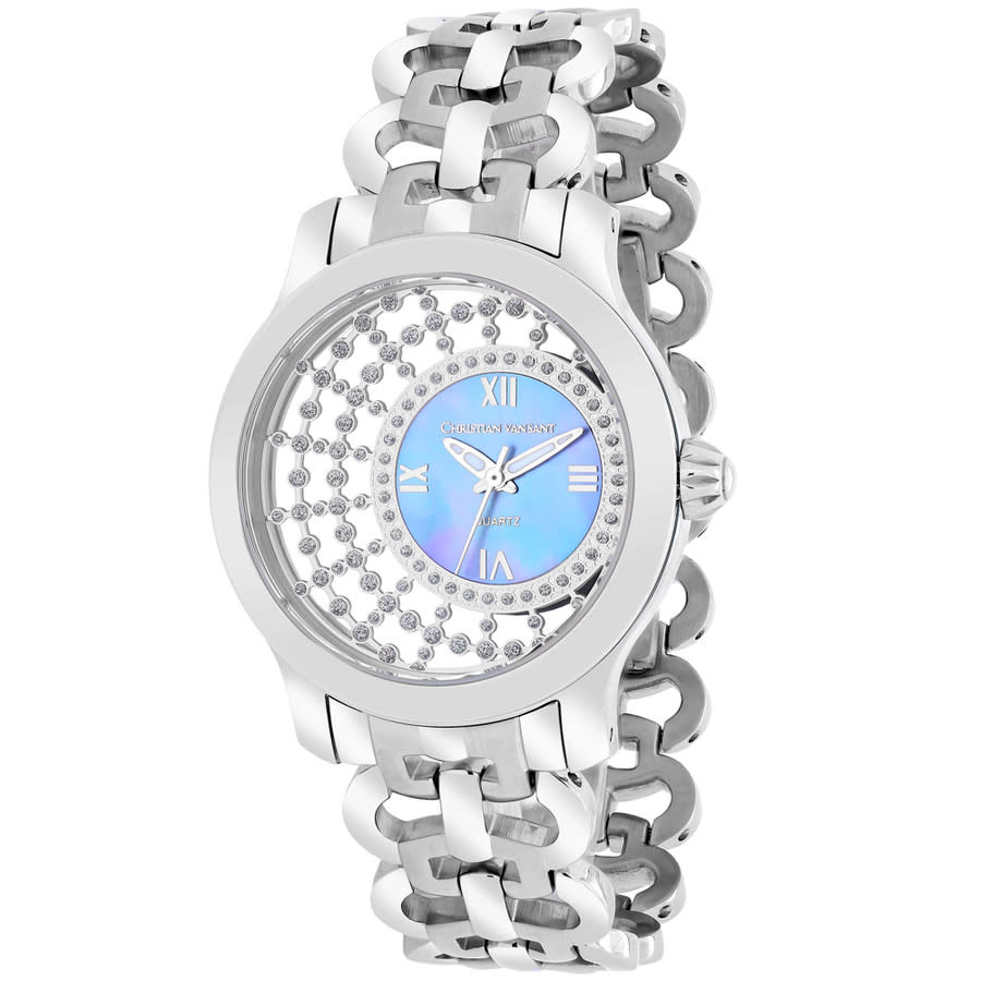 Silver-tone stainless steel case and bracelet. Fixed silver-tone stainless steel bezel. Mother of pearl dial with silver-tone hands and index hour markers. Dial Type: Analog. Quartz movement. Scratch resistant mineral crystal. Round case shape, case size: 36 mm. Band width: 20 mm. Deployment with push button release clasp. Water resistant at 50 meters / 165 feet. Functions: hour, minute, second. Delicate Series. Fashion watch style. Christian Van Sant Delicate Quartz Ladies Watch CV4412.