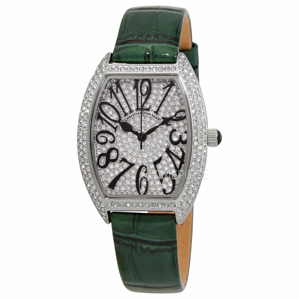 Stainless steel case with a green (calfskin) leather strap. Fixed stainless steel bezel set with crystals. White (crystal pave) dial with black hands and index hour markers. Dial Type: Analog. Quartz movement. Scratch resistant mineral crystal. Solid case back. Tonneau case shape. Case size: 42 mm. Case thickness: 10 mm. Band width: 14 mm. Tang clasp. Water resistant at 30 meters / 100 feet. Functions: hour, minute, second. Elegant Series. Fashion watch style. Christian Van Sant Elegant Quartz White Dial Ladies Watch CV4821G.