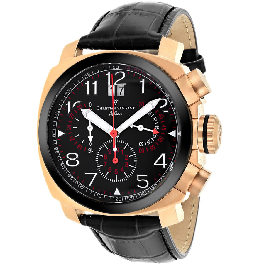 Rose gold-tone stainless steel case with a black leather strap. Fixed black-plated bezel. Black dial with luminous silver-tone hands and index hour markers. Minute markers. Tachymeter markers around the outer rim. Dial Type: Analog. Luminescent hands. Date display below the 12 o'clock position. Chronograph - three sub-dials displaying: 60 second, 30 minute and 1/10th of a second. Quartz movement. Scratch resistant mineral crystal. Screw down crown. Solid case back. Round case shape. Case size: 48 mm. Case thickness: 15 mm. Band width: 21 mm. Fold over clasp with a push button release. Water resistant at 100 meters / 330 feet. Functions: chronograph, tachymeter, date, hour, minute, second. Grand Python Series. Fashion watch style. Christian Van Sant Grand Python Chronograph Quartz Black Dial Mens Watch CV3AU11.