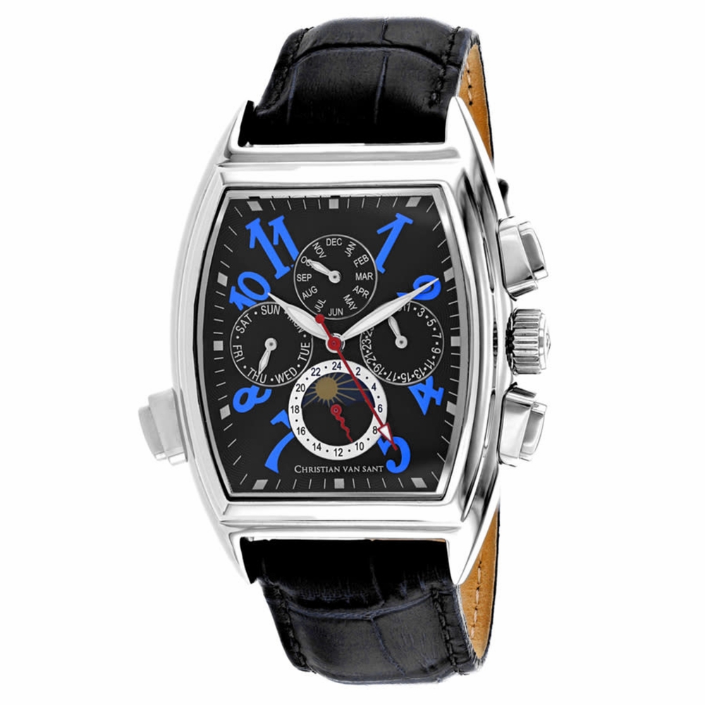 Silver-tone stainless steel case with a black leather strap. Fixed silver-tone stainless steel bezel. Black dial with silver-tone hands and Arabic numeral hour markers. Minute markers around the outer rim. Dial Type: Analog. Automatic movement. Scratch resistant mineral crystal. Rectangle case shape, case size: 45 mm, case thickness: 14 mm. Band width: 20 mm, band length: 7.5 inches. Buckle clasp. Water resistant at 50 meters / 165 feet. Functions: month, date, day, hour, minute, second. Grandeur Series. Fashion watch style. Christian Van Sant Grandeur Automatic Black Dial Mens Watch CV2133.